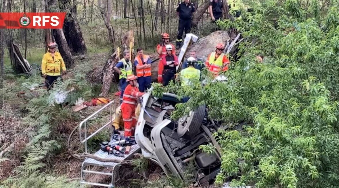 A man, believed to be in his 50s, was trapped for more than six hours after his truck rolled west of Cessnock in the NSW Hunter Valley.